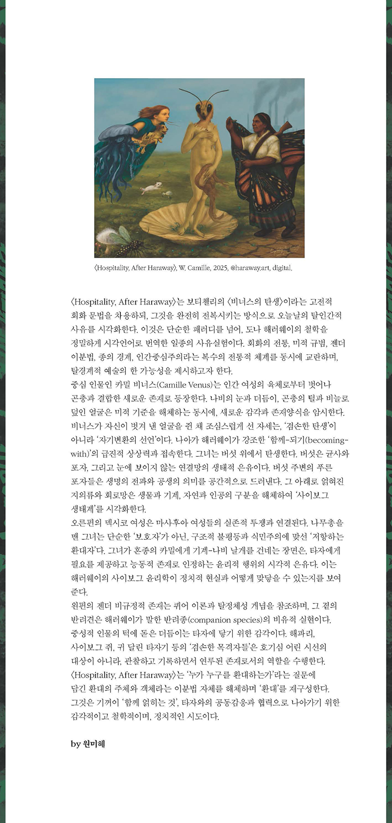 김애령 선생님의 신작 『애프터 해러웨이: 포스트휴먼의 다른 이야기 짓기』 표지는 원미혜 선생님의 그림으로 만들어졌습니다(원미혜 선생님은 여성학자이시자 또 저자인 김애령 선생님의 절친한 친구이십니다). 두 분의 우정의 산물이자 해러웨이의 글에 대한 지적인 응답이기도 한 그림 <환대>에 대해 원미혜 선생님께서 직접 설명 글을 쓰셨고, 『애프터 해러웨이』 뒷날개에는 원본 그림과 함께 이 글을 실었습니다. 해러웨이가 촉발한 지적 상상력에 대한 이미지 응답을 독자 여러분께서도 꼼꼼히 읽어 봐 주시길 부탁드립니다.