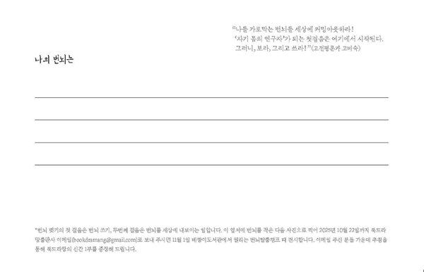 엽서 뒷면 아래에 작은 글씨로 번뇌를 써본 다음 사진으로 찍어 북드라망 이메일(bookdramang@gmail.com)로 보내주시면, 11월 1일 번뇌 탈출 캠프 때 베짱이도서관에 전시를 하겠다는 안내가 있습니다. 저희에게 보내시진 않더라도 꼭 번뇌를 써보시라고 말씀드리고 싶습니다.