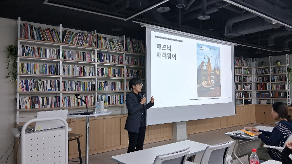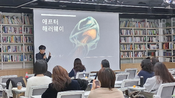 지난 10월 23일 목요일 저녁, 서소문에 있는 인터넷서점 알라딘서점 빌딩 1층에서 김애령 선생님의 <애프터 해러웨이> 북토크가 열렸습니다. 강연회는 알라딘에서 티켓 판매를 했는데 모두 40명의 독자분들이 짧은 신청 기간에도 불구하고 참여해 주셨습니다.