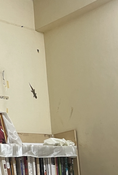 내 방은 학교 안에서 전망이 좋은 방으로 손 안에 꼽힐 것 같다. 다른 방에 많이 가본 건 아니지만, 그냥 그럴 것 같다. 꼭대기 층인 4층이라 복도에서는 아래로 아담하게 우거진 나무와 수풀을 탁 트인 하늘과 함께 볼 수 있고, 방 안 창문으로는 학교 본관 너머로 흐릿한 히말라야 산맥의 윤곽을 볼 수 있다. 여름철 밖보다 안이 더운 찜통현상은 시원한 뷰에 지불하는 대가다. 어쨌든 수풀 등과 가까이 있어서 여러 곤충, 날벌레들과의 동거는 당연한데, 이번엔 큼직한 도마뱀도 하나있다. 도마뱀은 정말 빠르다. 곁눈으로 흰 벽에 선득 지나가는 검은 물체를 보더라도 휙 고개를 돌리면 사라져 있다. 그래도 그 물체가 도마뱀인 것은 문득 고개를 들면 벽에 잠시 가만히 붙어있는 것을 볼 수 있기 때문이다. 지난번에는 모른 채 봉지 안을 들여다보다가 봉지 안에서 쉬고 있던(?) 도마뱀의 점프 습격을 받기도 했다.