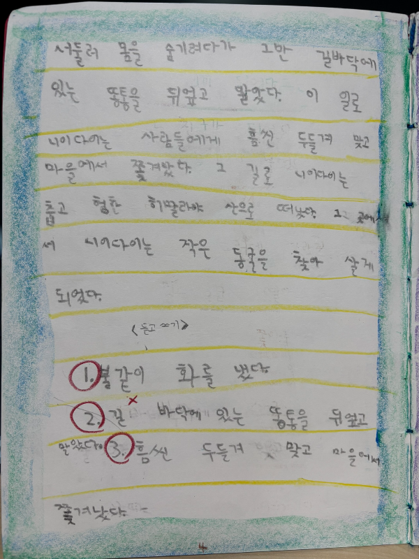 오늘부터 3일 동안 초등학교 2학년 학생이 공부한 부처님의 제자 똥지게꾼 니이다이 이야기를 들려드립니다. (발도로프 교육을 지향하는 공립초등학교의 '성인이야기' 수업으로 만들어진 노트입니다).