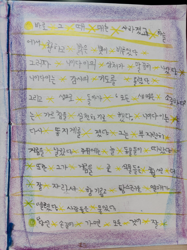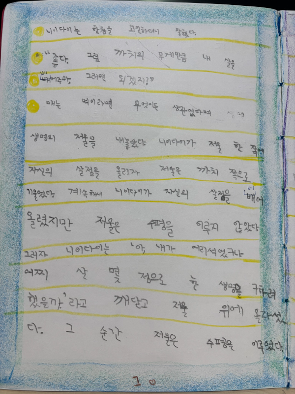 '모든 생명은 소중하다'는 말은 하나의 당위로 다가와 사실 어떤 실감도 주지 못할 때가 많습니다. 이런 무감각이 사유하지 않음이, 까치 한 마리를 먹어야 한다는 매의 말에 그 무게만큼의 살점을 떼주겠다는 생각으로 당연히 이끕니다. 그러나 한 생명을 구하는 데 살점의 무게는 상관이 없습니다. 생명의 저울은 살점의 무게로 기우는 것이 아니니까요. 이 감각을, 이 생각을, 우리가 일상에서 보다 자주 떠올릴 수 있다면, 나를 아끼듯 다른 생명을 아끼며, 똥지게꾼으로 빛나게 사는 삶이 그저 옛이야기 속에서만 가능한 건 아닐 거라고, 생각해 봅니다."