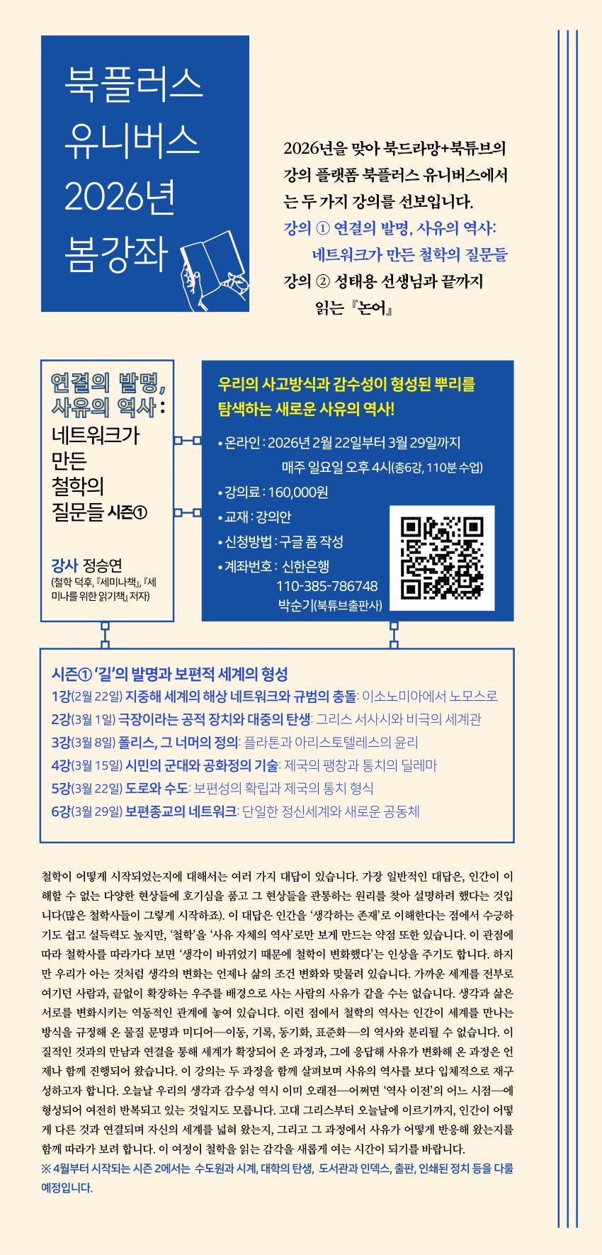 | 2026년 북플러스 봄강좌 ― ①새로운 감각을 열어주는 사유의 역사 + ②<논어> 끝까지 읽기 (2) | 2026.01.05 |