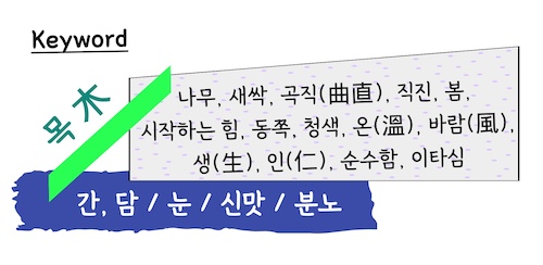 목의 기운은 동서양 모두에게 해당한다. 동서양의 단어 속에 목 기운이 지닌 뜻이 담겨있다. 목 기운을 색깔로 표현한다면 ‘청색’인데, 청색을 의미하는 영어단어 그린(green)은 ‘살아있는, 왕성한’이라는 어원을 가지고 있다. 재밌지 않은가? 또 봄을 뜻하는 스프링(spring)은 분출하고 튀어 나간다는 의미를 지니고 있다.