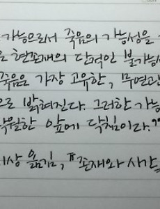 전체3599 아버지라는 ‘두려움’ 크리스티네 뇌스틀링커 -『오이대왕』 아버지라는 ‘두려움’크리스티네 뇌스틀링커, 『오이대왕』 필자의 말대학교를 졸업한 뒤 2015년 겨울부터 올해 봄까지 중학교 아이들과 인문학을 공부했다. 2년간 함께했던 아이들을 보내고 나니 문득 그 시간들을 이대로 흘려보내기에는 아깝다는 생각에 그 간의 수업들을 가지고 이 글을 쓰기 시작했다. 그러므로 이 글은 나만의 글이 아니다. 나의 목소리와 더불어 아이들의 목소리 역시 읽는 이들에게 닿을 수 있기를 간절히 소망한다. * 글에 등장하는 아이들의 이름은 모두 가명을 사용하였습니다. 0. 볼프강은 수학은 서투르지만 수영 하나는 자신 있는 평범한 중학생이다. 그런데 어느 날, 볼프강의 집에 느닷없이 왕을 자칭하는 자그마한 오이 모양의 괴물 하나가 나타난다. 그가 말하길 자신은 ‘오이대왕’으로, 볼프강네 집.. 2019. 1. 8. 하이데거, 존재와 시간 - '죽음을 건너뛸 수는 없다' 하이데거, 존재와 시간 - '죽음을 건너뛸 수는 없다' 생각해 보면 아주 간단한 말이다. '누구도 죽음을 피할 수 없다'. 하이데거와 나치의 관계, 나치가 '죽음'을 어떤 식으로 선동했는지 하는 것들을 생각하면, 적어놓은 저 문장 앞에서 주춤할 수밖에 없다. 자라면서 보고 들어온 수많은 영상들이 잠시 스친다. 그럼에도 불구하고, 말할 수밖에 없다. 나는 저 문장을 읽고 적으면서 어떤 '편안함' 같은 걸 느꼈다. 저 끝에 '소멸'이 있다는 것, 내가 어떻게 하든 그것을 피할 수 없다는 사실은 얼마나 큰 안도감을 주는지……. 사실 '죽음이 저 끝에 있다'는 말은 커다란 오해다. '죽음'은 저 멀리 있는 것이 아니다. 그것은 살아있는 내내, 생(生)의 바로 옆에 거리 없이 있다. 하이데거가 '탁월한 앞에 닥침.. 2019. 1. 7. 물러날 때를 아는 자가 진정한 승자 물러날 때를 아는 자가 진정한 승자 나에게 아버지는 어린 시절 추종과 숭배의 대상, 사춘기 시절 가능하면 피해야n하는 사람, 돌아가시고 난 후 가끔 보고싶은 애증의 대상이다. 아마 아들도 이와 비슷하게 나를 생각할 것이다. 아직은 추종과 피하기의 중간 단계에 있지만 어느 순간 자신의 자아를 찾기 위해 나를 극복의 대상으로 여길 것이다. 우리 아빠는 엄청 많이 먹는다! 나의 아버지는 어린 시절 고관절염을 앓았었다. 하지만 적시에 치료하지 못해 왼쪽 다리가 오른쪽보다 약 7-8cm 정도 짧았다. 4급 정도의 장애 등급을 받았고, 걸을 때 한쪽 다리를 절뚝거릴 수밖에 없었다. 진해에 살았을 때 기억이니 아마도 5-6살 무렵일 것이다. 어린 내 눈에는 아버지의 모든 것이 멋있고 좋아보였나 보다. 한 쪽 다리가 .. 2019. 1. 4. 메이지 헌법의 구성과 신체성 - (1) 메이지 헌법의 구성과 신체성 - (1) 통치의 대권은 천황이 조종(祖宗)으로부터 받아 자손에게 전한다.입법, 행정 백규(百揆)의 일은 무릇 국가가 임어해서 신민을 진무하는 것이고,이는 하나로서 지존이 모두 그 강령을 쥐지 않음이 없다.비유하자면 인신에 사지백해(四支百骸)가 있고 정신(精神)의 경락(經絡)은 모두 그 본원을 수뇌(首腦)로 돌아가는 것과 같다. ─이토 히로부미(伊藤博文) 교주(校註), 『헌법의해(憲法義解)』 메이지 헌법에서의 신체동양에서의 ‘통치(統治)’ 개념은 무엇인가? 결국 다스린다는 것은 일종의 지배와 복종의 관계를 상정하며, 이는 단순히 폭력의 차원이 아닌 결국 사람들은 왜 다스림에 복종하는가라는 합법성 내지 정당성의 문제가 뒤따른다. 동양에서 전통적으로 다스림의 논리는 어떠했는가?.. 2019. 1. 3. 이전 1 ··· 422 423 424 425 426 427 428 ··· 900 다음
