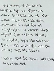 전체3598 모든사람과 잘 지낼 필요 없습니다 모든사람과 잘 지낼 필요 없습니다 질문1. 운전하기가 두렵습니다.Q> 저는 운전 면허증을 오래전에 땄는데요, 실제로 운전을 하고 있지는 않습니다. 제겐 운전에 대한 두려움이 있는 것 같아요. 아주 어릴 때 텔레비전을 봤는데 예쁜 미술 선생님이 의족을 하고 나왔어요. 어느 날 운전을 하다가 상대방의 과실로 교통사고가 난 거에요. 그래서 약혼자도 떠나는 등. 제가 어렸을 때 그걸 보고 충격을 받았나 봐요. 단 한 번도 운전할 생각을 해보지 않았는데, 운전을 해야 할 일이 생겼어요. 두려움을 안고서라도 운전을 할 수 있는지 아니면 극복을 해서 운전을 해야 하는지 아니면 아예 운전할 생각을 하지 말아야 하는지 궁금합니다. 정화스님 : 현생인류하고 다른 인류하고 가장 큰 차이점은 과거와 현재를 중심으로 사느냐 아.. 2018. 8. 14. 『보르헤스, 문학을 말하다』 - '사람들은 서사시를 필요로 한다' 『보르헤스, 문학을 말하다』 - '사람들은 서사시를 필요로 한다' '이야기'는 공통의 감각을 생산해 낸다. 어떤 사건을 마주하면서 느끼는 감정 같은 것들이다. 백명의 사람이 있으면 저마다 느끼는 바가 다르다. 그런데 그렇게 다르면서도 사실은 비슷비슷한 감정들을 느낀다. 나는 그런 감정이 '자연적'이라거나, '원래 그렇다'고 믿지 않는다. '느끼는 방식'도 사실은 발명된 것이라고 생각한다. 만약에 동시대의 한 사회 안에서 사회구성원들이 '느끼는 방식'이 극단적으로 서로 다르다면, 사회는 유지되지 않을 것이다. 서로 다른 가운데서도 그 다름을 지탱하는 공통의 지반이 있기 때문에 '사회'의 모양을 갖추고 있는 것이다. 우리 사회로 치자면, '자본주의', '화폐'에 대한 서로 비슷한 욕망 같은 것들이다.('아이.. 2018. 8. 13. 김해완, 『뉴욕과 지성』 미니강의 김해완, 『뉴욕과 지성』 미니강의 4월 말에 출간되어 여전히 절찬리에 판매되고 있는 김해완 선생님의 뉴욕 지성 大(대)탐사, 『뉴욕과 지성』 북파티에서 진행되었던 미니강의 영상입니다. 책을 구입해 읽어보신 분들이 보셔도 좋고, 아직 읽지 못하신 분들이 보셔도 좋을 듯하여 올립니다. 게다가, 공지해드린 것처럼 8월17일에는 사상 초유의 북콘서트! 아빠와 딸이 함께 하는 북콘서트도 열립니다.(클릭하시면 공지 페이지로 이동합니다) 콘서트에 가시기 전에 한번씩 보시고 가도 좋지 않을까요? ^^ 『뉴욕과 지성』 구입하러 가기 2018. 8. 10. 세포들로 이루어지는 유기체, 그리고 사회 - 上 세포들로 이루어지는 유기체, 그리고 사회 - 上 신체에서 사상감각(思想感覺)을 하는 것은 전적으로 뇌수의 집합이라 하더라도사회는 결코 이와 같을 수 없다.왜냐하면 어리석은 자 역시 감각할 수 있기 때문이다.즉 이를 다른 말로 하자면 일신(一身)의 사상감각은오직 신체 중 하나의 국부인 뇌수에만 있지만,사회에서는 사상감각이 전적으로 사회 사이에 분포하고 있다.─바바 타쓰이(馬場辰猪), 「본론(本論)」(1882) ‘organism’과 ‘有機’ 우리는 신체를 표현할 때 유기적이다, 유기체다라는 말을 자주 사용한다. 이는 사회나 국가를 사용하는 데서도 마찬가지다. 그러나 이 때 유기적이라는 의미는 도대체 무엇인가? 근대 동아시아를 볼 때 우리는 서구의 개념어들을 번역한 말들을 주로 다룰 수밖에 없다. 개념어들이 .. 2018. 8. 9. 이전 1 ··· 446 447 448 449 450 451 452 ··· 900 다음