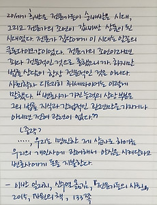 전체3597 고향, 태어난 곳이 아니라 살아온 곳의 이름 고향, 태어난 곳이 아니라 살아온 곳의 이름 1492년 콜럼버스가 신대륙을 발견한 순간부터 오늘날 인류는 홈-리스라는 공통운명을 갖게 되었다는 것이다. 지난 500년 동안 우리는 방방곡곡 연결된 세계 속에서 차례차례 집을 잃어버렸고, 조상이 살던 땅에서 뿌리 뽑혔다. 그래서 오늘날 인간다운 삶을 위한 키워드는 두 가지다. 첫째는 내가 태어난 땅이 여러 세대가 삶을 지속할 만큼 풍요로운가이고, 둘째는 낯선 땅으로 옮겨 갔을 때 새로이 뿌리를 내릴 수 있는 능력이 있는가이다. 이 두 조건 중 하나라도 갖추기 위하여 우리는 모두 필사적으로 살고 있다. 언어를 배우고, 비자를 얻고, 노동을 팔고 있다.- 김해완, 『뉴욕과 지성』, 79쪽 우리 아버지는 1950년 1월 서울에서 태어나 인천에서 자라셨다고 한다. .. 2018. 7. 10. 이반 일리치 『전문가들의 사회』 - 겁내지 않고 살아가는 길 7월 덮은책다시보기는 쉽니다. 6월 당첨자 발표도 8월 문제와 함께 올리도록 하겠습니다. ^^ 이반 일리치 『전문가들의 사회』 - 겁내지 않고 살아가는 길 1년 전쯤에 집으로, 엄청 두꺼운 서류뭉치가 배달되어 온 적이 있었다. 내가 태어나기도 전에 엄마가 분양을 받은 상가와 관련된 소송 서류였다. 서류 제목이 무엇이었는가 하면, '소유권 확인 및 부당이득금 반환 소송'이었는데, 그 '상가'와 관련된 사연은 일단 뒤로 하고 어찌나 무서웠는지 모른다. 피고인 50여명에 대해 청구된 '부당이득금'이 무려 2억 얼마였던 데다가, 서류에는 읽으면 읽을수록 '소송 서류는 왜 한국말로 안 쓰는거야' 싶을 정도로 해독하기 어려운 법률용어가 난무하고 있었기 때문이다. 심지어 처음에는 우리가 피고인지도 몰랐다. '부당이득.. 2018. 7. 9. 아기의 말, “엄마”의 용법 “엄마”의 용법 돌이 지나면 아기들은 자기 욕구에 대한 주장이 강해진다고 한다. 어느 정도로 강해지냐 하면… 생후 18개월의 아기를 보다 보면 바로 그 개월 수의 욕이 주양육자 입에서 절로 나올 정도라고 한다.;; 아직 18개월에서 4개월이 모자라지만, 우리 딸도 주양육자인 아빠가 폭발하는 화를 다스리고자 (다이어트로) 몇 달간 입에 대지 않았던 단 과자를 한봉지 전부 먹어야 했을 만큼까지는 주장이 강해졌다. 지난번에도 말했지만, 할 줄 아는 말이라고는 아직 ‘엄마’ ‘아빠’가 전부인 거나 마찬가지인 상태. 그렇다면 딸은 뭘로 주장을 하는가. 울음과 소리지르기, 자해(?)로 한다. 자기가 원하는 대로 엄마나 아빠가 하지 않을 때(혹은 자기가 하고 싶은 걸 막을 때) 가장 빈번하게 하는 행동은 역시 우는 .. 2018. 7. 6. 카프카 읽기 - 시간의 미로, '지금'의 폭발 시간의 미로, '지금'의 폭발 허무를 향해 쏘아올린 화살 고대 그리스인들은 서양의 전통적 시간표상을 규정했습니다. 그들은 시간을 점들이 무한히 이어진 양적인 연속체라고 생각했고, 그것을 원환(圓環)으로 표현했지요. 아리스토텔레스는 『자연학』에서 시간을 ‘이전’과 ‘이후’에 따라 측정되는 운동 지수로 규정했습니다. 시간이 기하학적 점과 유사한 비연장적인 시점(지금)으로 나뉨으로써 연속성을 보장받는다고 본 것이지요. 여기에서 시점은 그 자체로 시간 연속성의 지표가 됩니다. 과거와 미래를 결합하는 동시에 분리시키는 순수한 경계로서 말이예요. 이후 서양에서는 그리스적 원환을 대신하여, 직선으로 구현된 기독교적 시간 이미지가 나타났습니다. 이제 시간은 창조로부터 종말로 향해가는 비가역적 연속이 되었습니다. 그리고.. 2018. 7. 5. 이전 1 ··· 452 453 454 455 456 457 458 ··· 900 다음